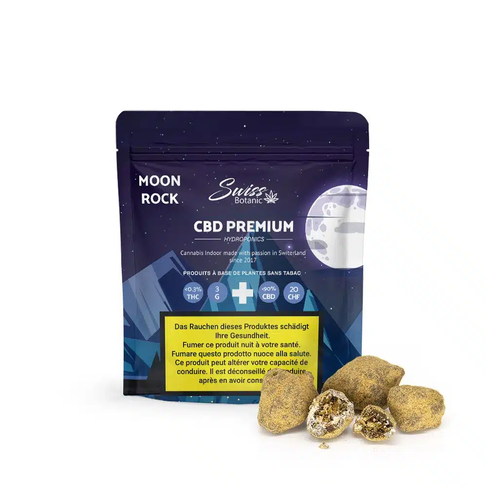 La « recette » pour faire la «Moonrock » est assez simple : on trempe des fleurs de CBD dans un extrait de chanvre de haute qualité, à la main, puis on saupoudre le tout avec de la résine de chanvre (pollen). Rendant ainsi l’homogénéité du produit et la concentration élevée en CBD (<90%)